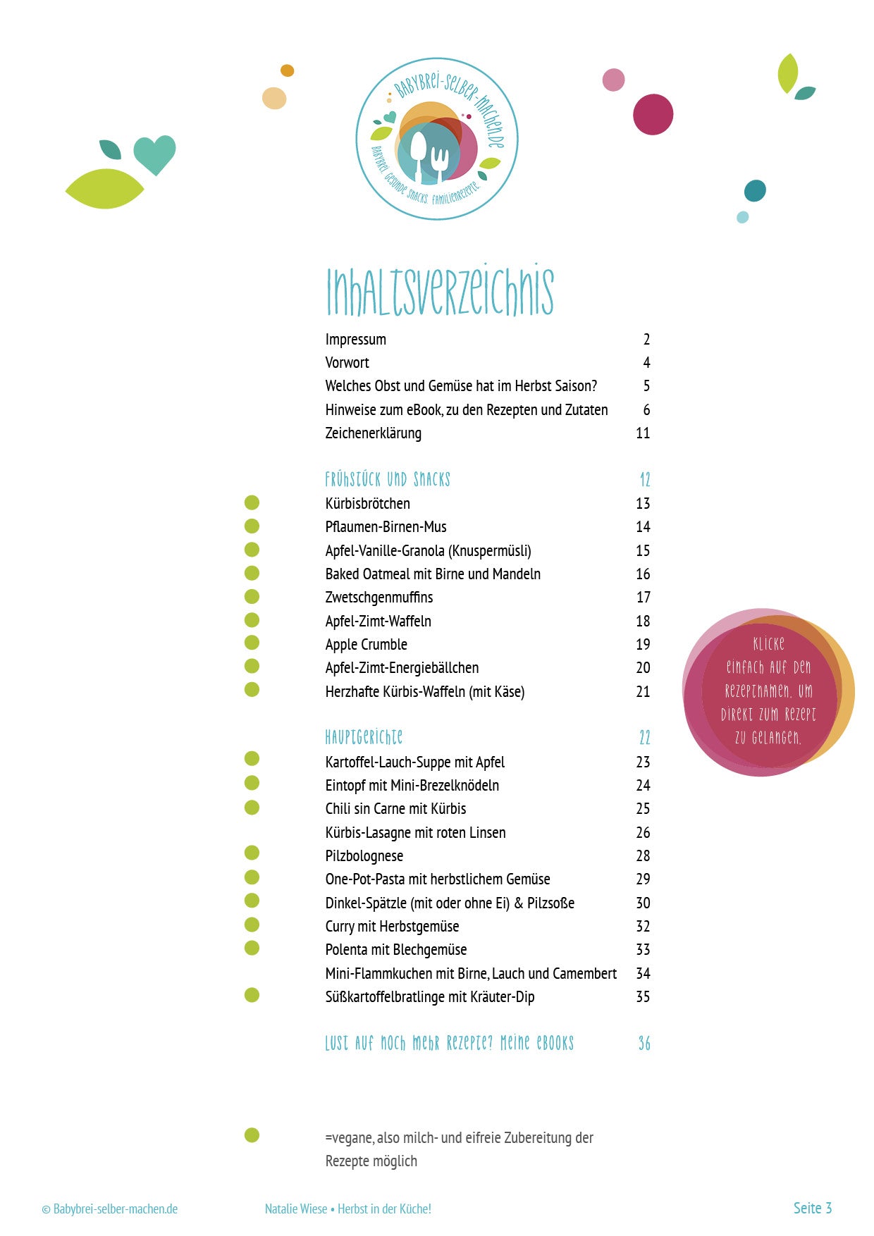 Z. B. Apfel-Vanille-Granola, Kürbis-Brötchen, Pflaumen-Birnen-Mus, Apfel-Zimt-Waffeln, Kürbis-Lasagne, Flammkuchen mit Birne & Camembert oder One-Pot-Pasta mit Herbstgemüse. -