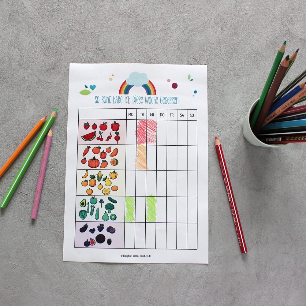 Diese liebevoll gestaltete Tabelle hilft, auf einen Blick zu erkennen, wie bunt und vielfältig eure Ernährung über die Woche hinweg war – ganz ohne Zwang, aber mit jeder Menge Spaß!